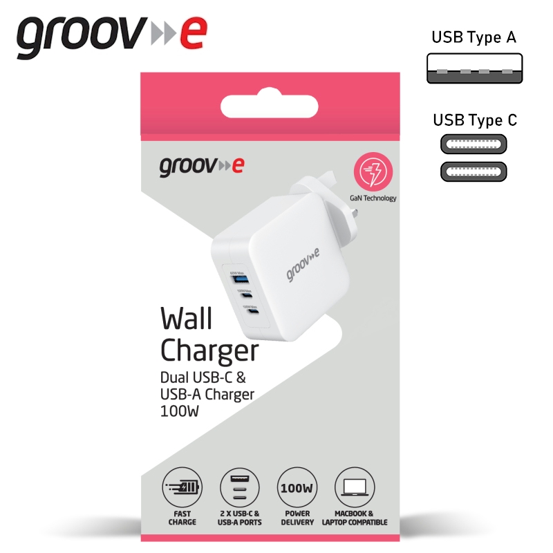 Groov-e USB A and Type C 100W GaN Mains Charger (GVMA110WE)