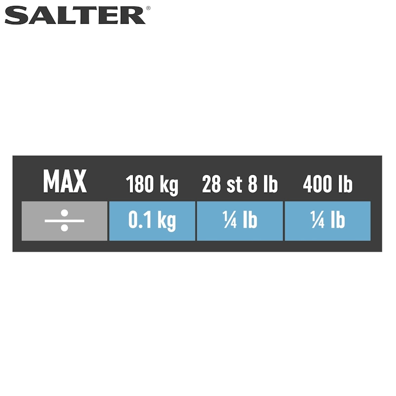 - Max weight x resolutions: 180kg x 100g, 28st x 0.25lb