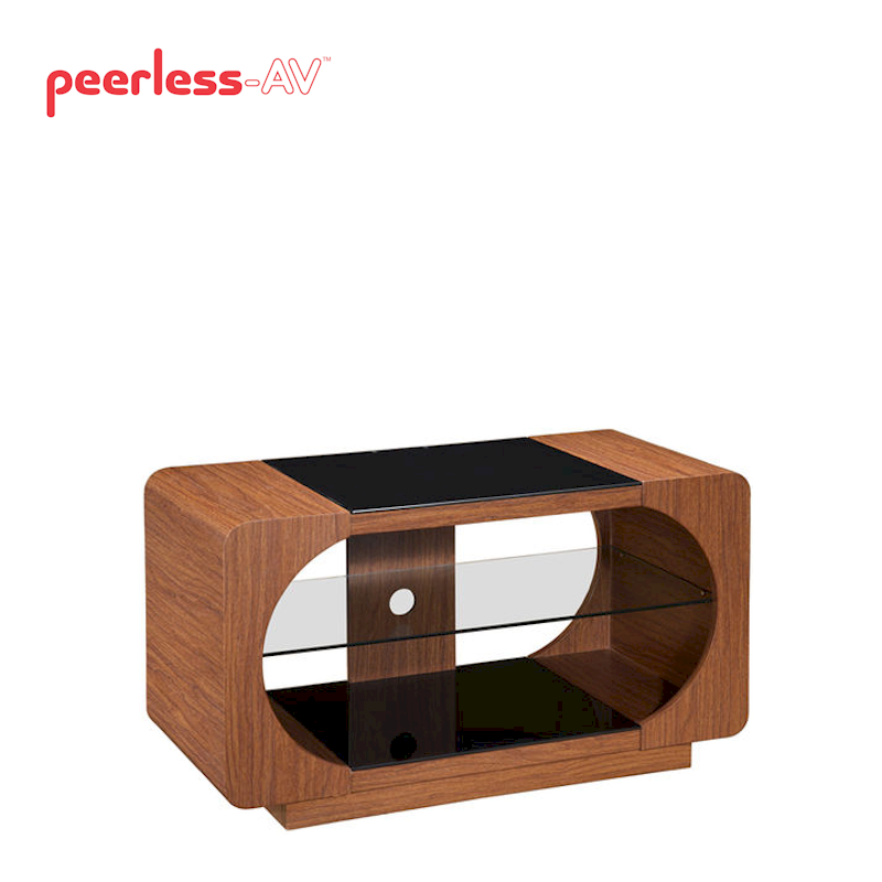 A stylish cabinet with a retro twist, combines wood effect panels with black glass inserts on the top and bottom with clear glass equipment shelf.