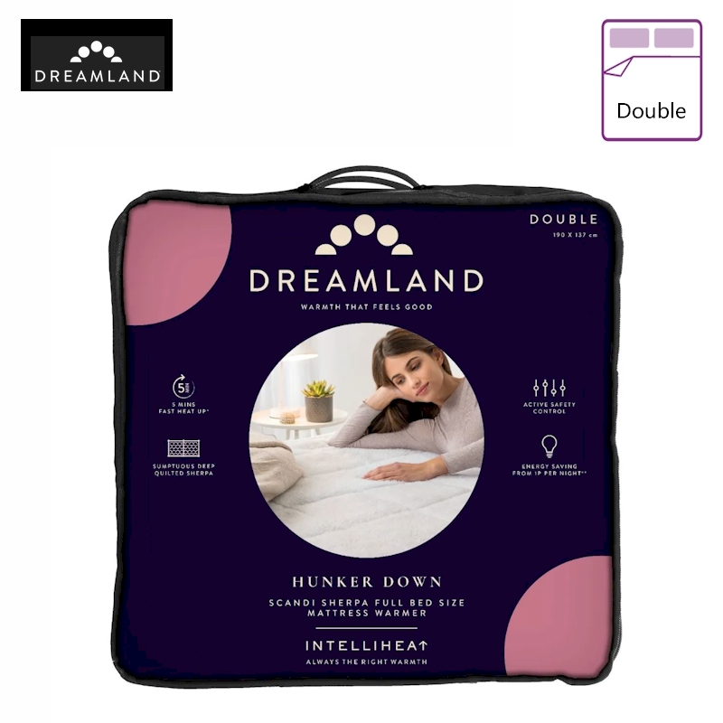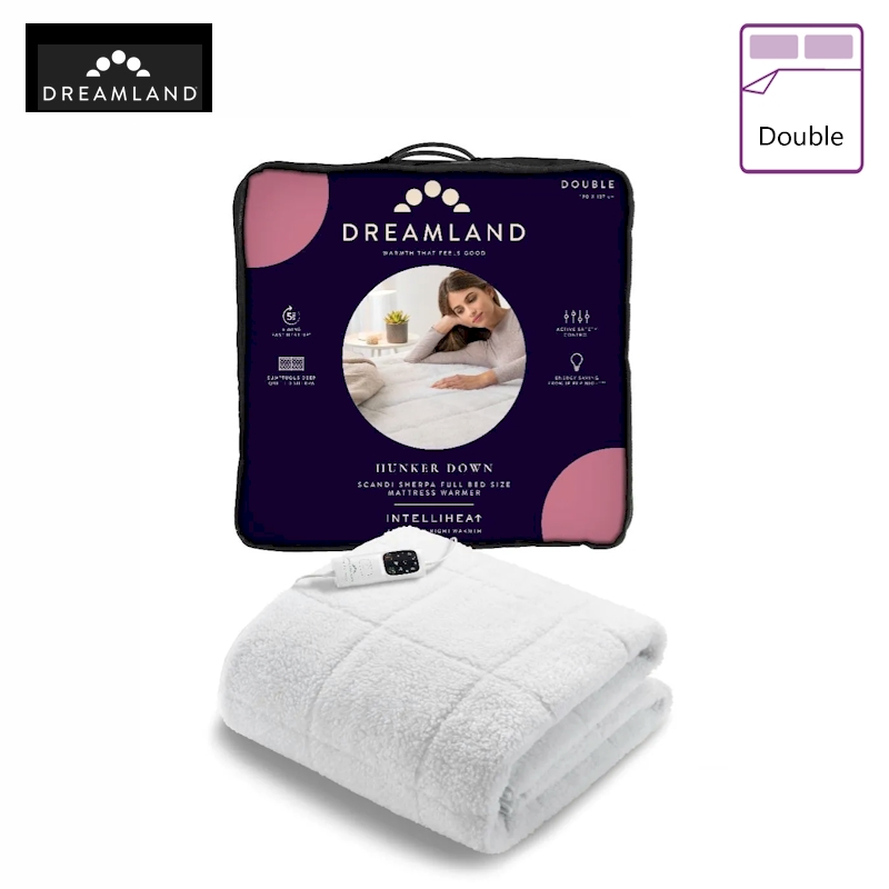 Double bed sized Dreamland blanket that covers the whole bed, featuring synthetic fleece and one digital control with five heat levels.