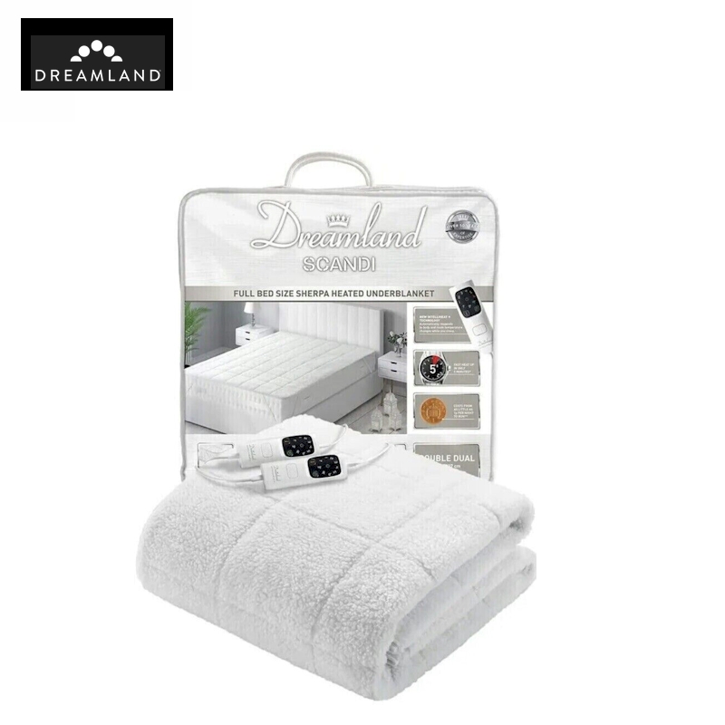 Super king-sized Dreamland blanket that covers the whole bed, featuring synthetic fleece and two digital control with five heat levels.