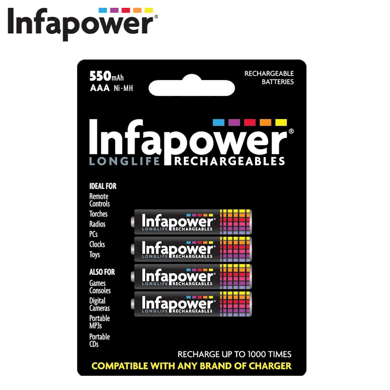4 X AAA Rechargeable Batteries from Infapower. Ideal for Remote controls, Radios, Torches, PC's, Clocks, Toys, Games consoles, Digital digital cameras, Portable MP3s,