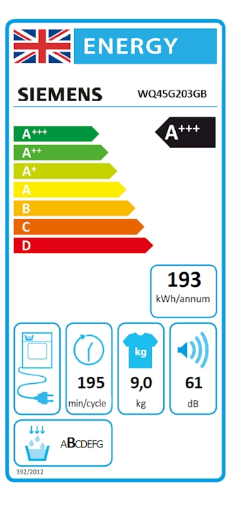 Energy efficient tumble dryer from Siemens using a heat pump instead of a conventional element, drying times will be longer, but your energy use will be lowered.